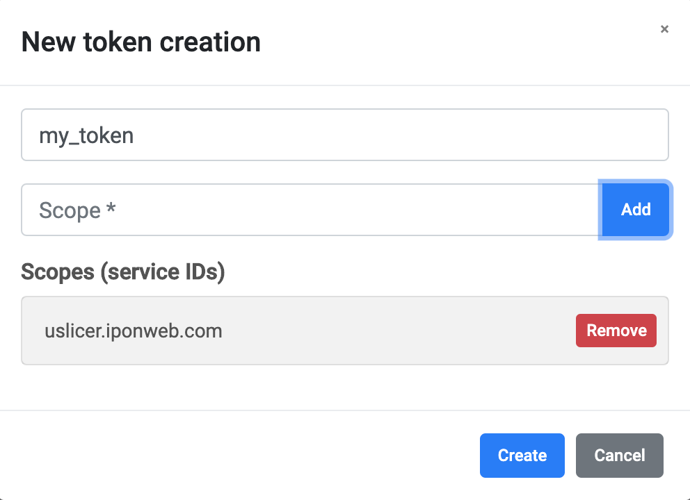 Enter token Name and Scope (uslicer.iponweb.com) in the appeared New token creation dialog box.