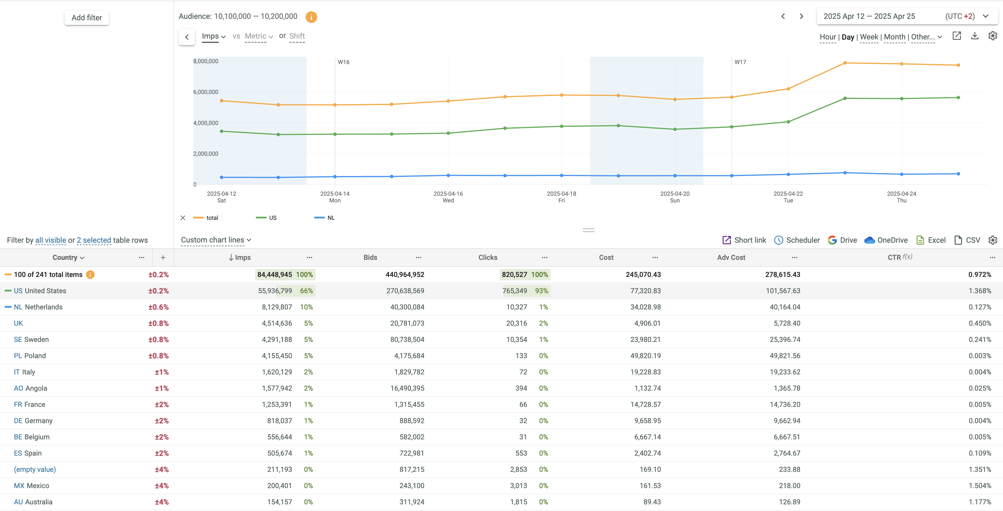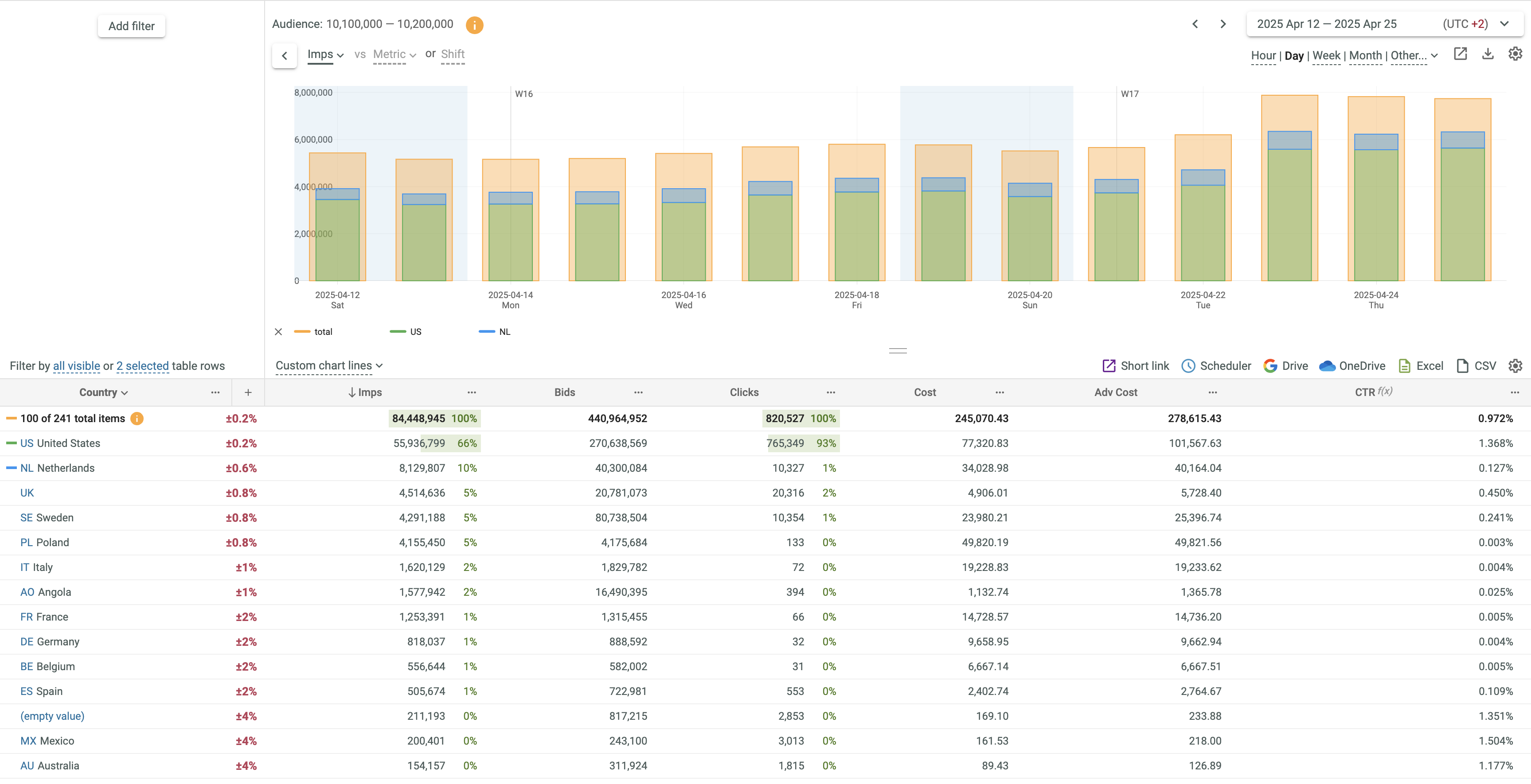 - If 2 metrics or time shift are selected, Lines and Line + Column options only are supported. The first metric is always displayed as Line. The second metric can be displayed as Line or Column. You can swap metrics by clicking the vs link.