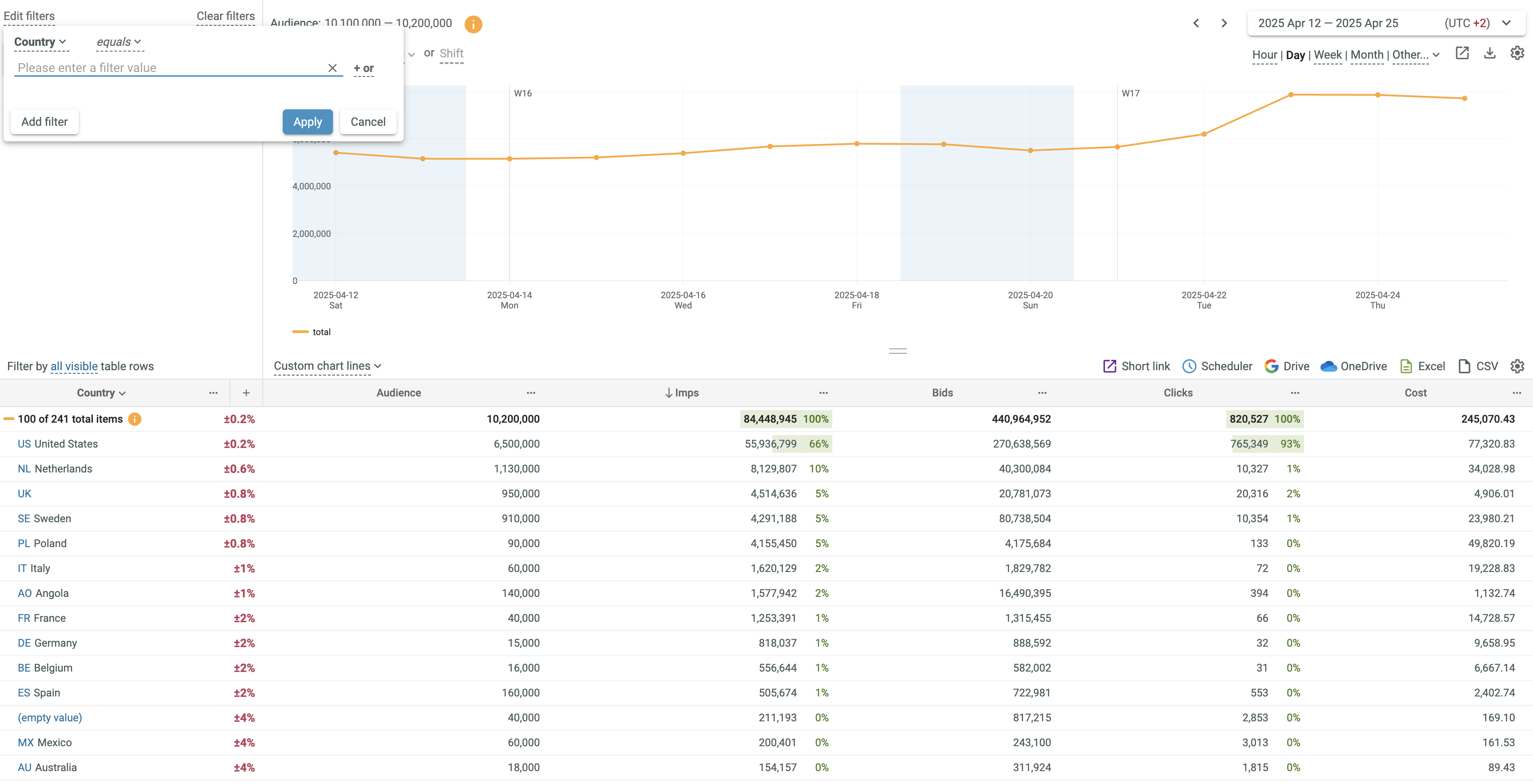 - See that the advanced filter is applied to all visible countries.